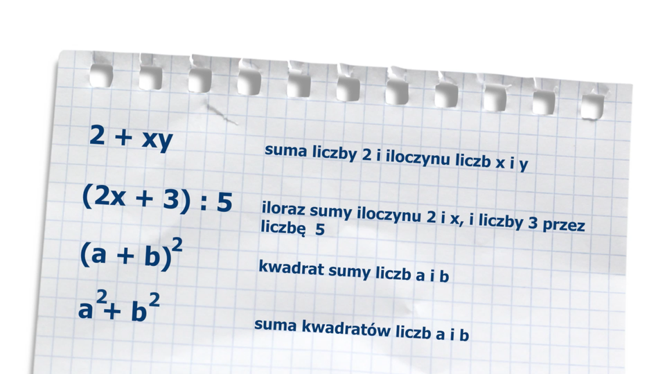 Animacja przedstawia wyrażenia algebraiczne wraz z ich opisem słownym.