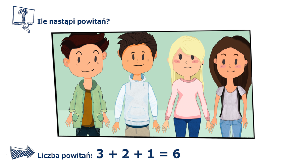 Animacja przedstawia sposób obliczenia liczby powitań czterech osób.