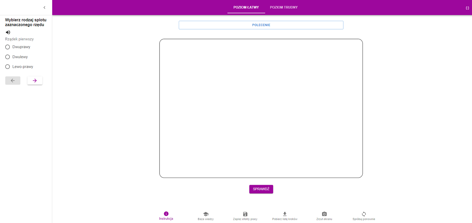 Ekran startowy programu przedstawia pierwsze zadanie, które ma cztery kroki. Każdy krok polega na dokonaniu przez użytkownika odpowiedniego wyboru rodzaju splotu zaznaczonego rzędu. Po zaznaczeniu właściwych pół należy kliknąć na znajdujący się na środku dolnej części ekranu przycisk „SPRAWDŹ”.