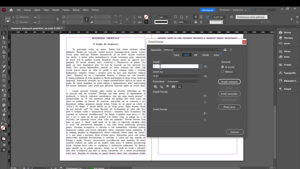 W składanym tekście w wierszu pozostał wiszący 1. akapitowym, 2. wydawniczego, 3. wdowa, 4. złożonej, 5. spójnik, 6. layoutu, 7. korektor, 8. format, 9. grafika, 10. trackingu, 11. typograficznych, 12. łamów, 13. szeryfom, 14. szeryfowym, 15. kolumna, 16. marginesów, 17. znaki korektorskie, 18. akapit. Możesz sprawdzać automatycznie całą publikację i zastosować tzw. kod GREP. Ale to jeden wiersz, w związku z tym wystarczy zmiana lokalna tekstu. Do tego celu użyjesz narzędzia typograficznego pozwalającego na lokalną zmianę składu partii tekstu, czyli 1. akapitowym, 2. wydawniczego, 3. wdowa, 4. złożonej, 5. spójnik, 6. layoutu, 7. korektor, 8. format, 9. grafika, 10. trackingu, 11. typograficznych, 12. łamów, 13. szeryfom, 14. szeryfowym, 15. kolumna, 16. marginesów, 17. znaki korektorskie, 18. akapit - lokalnej zmiany światła pomiędzy znakami w zaznaczonej partii tekstu.