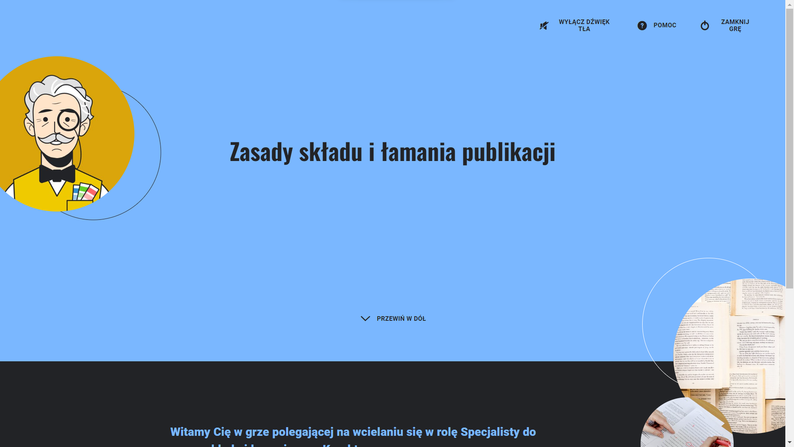 Widok ekranu gry edukacyjnej Zasady składu i łamania publikacji
