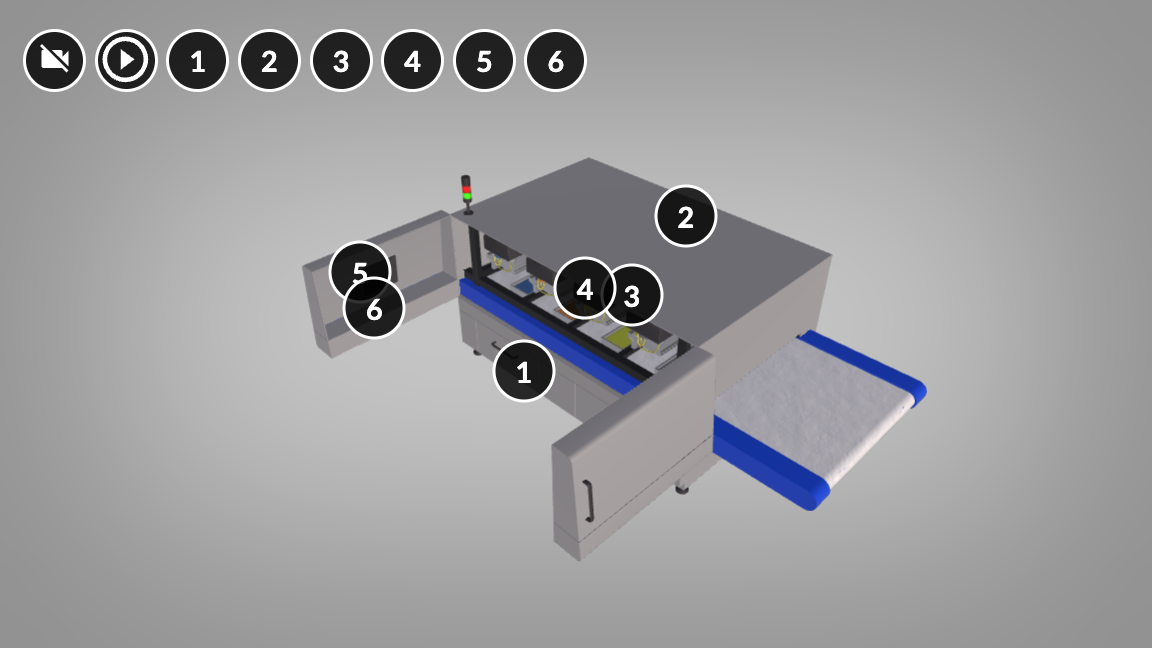 Przycisk awaryjny. Urządzenie wyposażone jest w łatwo dostępne dla użytkownika systemy bezpieczeństwa - dłoniowe przyciski awaryjne znajdują się w przedniej i tylnej części urządzenia oraz wewnątrz tylnych szaf. Jeśli zaistnieje konieczność zatrzymania działania urządzenia z powodu awarii lub jakiejkolwiek innej przyczyny należy nacisnąć dłoniowy przycisk zatrzymania awaryjnego, a system zostanie zablokowany.