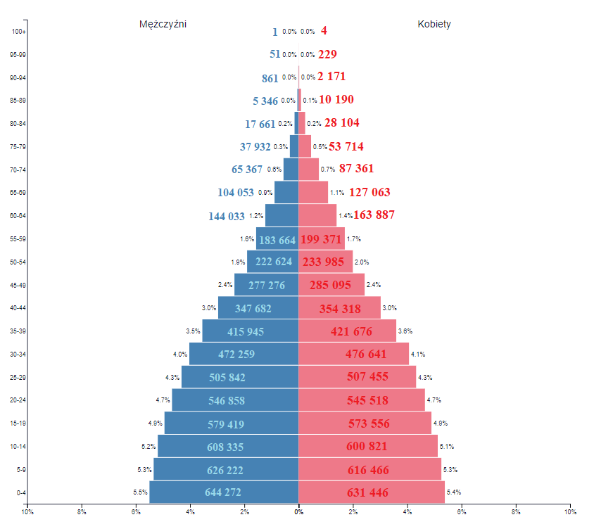 Wykres przedstawiający piramidę wieku społeczeństwa starzejącego się. Z lewej strony podziałki liczbowej określającej pięcioletnie przedziały wiekowe zestawiono słupki niebieskie dla mężczyzn, z prawej strony – różowe dla kobiet. Kształt piramidy wskazuje na typ struktury wiekowej społeczeństwa starzejącego się. Jest regresywny, ze stosunkowo niską liczbą urodzeń i podobną liczbą zgonów oraz coraz bardziej starzejącą się ludnością. Piramida ma kształt grzyba. W wieku 0‑4 jest ok. 300 tys. mężczyzn i 280 tys. kobiet, w grupie 5‑9 jest ok 285 tys. mężczyzn i 276 tys. kobiet, w grupie 10‑14 jest 260 tys. mężczyzn i 250 tys. kobiet, w grupie 15‑19 jest 280 tys. mężczyzn i 260 tys. kobiet, w grupie 20‑24 jest 345 tys. mężczyzn i 335 tys. kobiet, w grupie 25‑29 lat jest 335 tys. mężczyzn i 325 tys. kobiet, w grupie 30‑34 jest 310 tys. mężczyzn i 300 tys. kobiet, w grupie 35‑39 jest 300 tys. mężczyzn i 290 tys. kobiet, w grupie 40‑44 jest 330 tys. mężczyzn i ok 330 tys. kobiet, w grupie 45‑49 jest 340 tys. mężczyzn i 335 tys. kobiet, w grupie 50‑54 jest 320 tys. mężczyzn i 315 tys. kobiet, w grupie 55‑59 jest 300 tys. mężczyzn i 300 tys. kobiet, w grupie 60‑64 jest 280 tys. mężczyzn i 280 tys. kobiet, w grupie 65‑69 jest 290 tys. mężczyzn i 300 tys. kobiet, w grupie 70‑74 jest 250 tys. mężczyzn i 270 tys. kobiet, w grupie 75‑79 jest 180 tys. mężczyzn i 190 tys. kobiet, w grupie 80‑84 jest 120 tys. mężczyzn i 140 tys. kobiet, w grupie 85‑89 jest 100 tys. mężczyzn i 120 tys. kobiet, w grupie 90‑94 jest 20 tys. mężczyzn i 60 tys. kobiet, w grupie 95‑99 jest 10 tys. mężczyzn i 25 tys. kobiet, w grupie 100+ jest kilka tys. mężczyzn i podobna liczba kobiet.