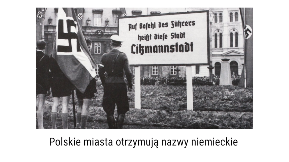 ![Plansza o tytule „Represje wobec ludności polskiej” składa się z dwóch ilustracji. Po lewej stronie planszy umieszczono podpisane zdjęcie osadzonych w obozie koncentracyjnym w Auschwitz [czyt.: auszwic] dzieci. Ubrane są one w za duże na nich obozowe pasiaki. Mają czapki lub chusty na głowie. Znajdują się za obozowymi drutami pod napięciem. Po prawej stronie planszy jest fotografia z łapanki ulicznej w Warszawie. Na zdjęciu widać idących w eskorcie niemieckich żołnierzy schwytanych na ulicy mężczyzn. Ubrani są w garnitury lub marynarki, koszule z krawatami i noszą na głowach kapelusze. Wszyscy idą z podniesionymi do góry rękami. Idący z przodu po prawej stronie zdjęcia żołnierz niemiecki ma mundur wojskowy, hełm na głowie i broń przewieszoną przez ramię.](https://static.zpe.gov.pl/portal/f/res-minimized/R1RZk2EkfT4HJ/1713169542/2ZShrLUCbP9ii324EWchIydsXLBvui4l.png)