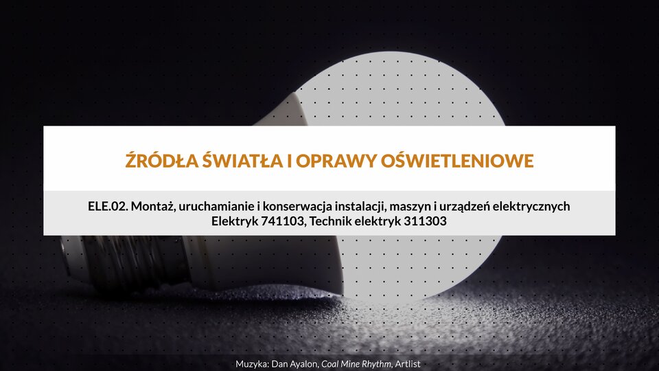 Film edukacyjny pt. „Źródła światła i oprawy oświetleniowe „ dla klasyfikacji ELE.02 Montaż uruchamianie i konserwacja instalacji, maszyn i urządzeń elektrycznych, zawód Elektryk 741103, Technik elektryk 311303