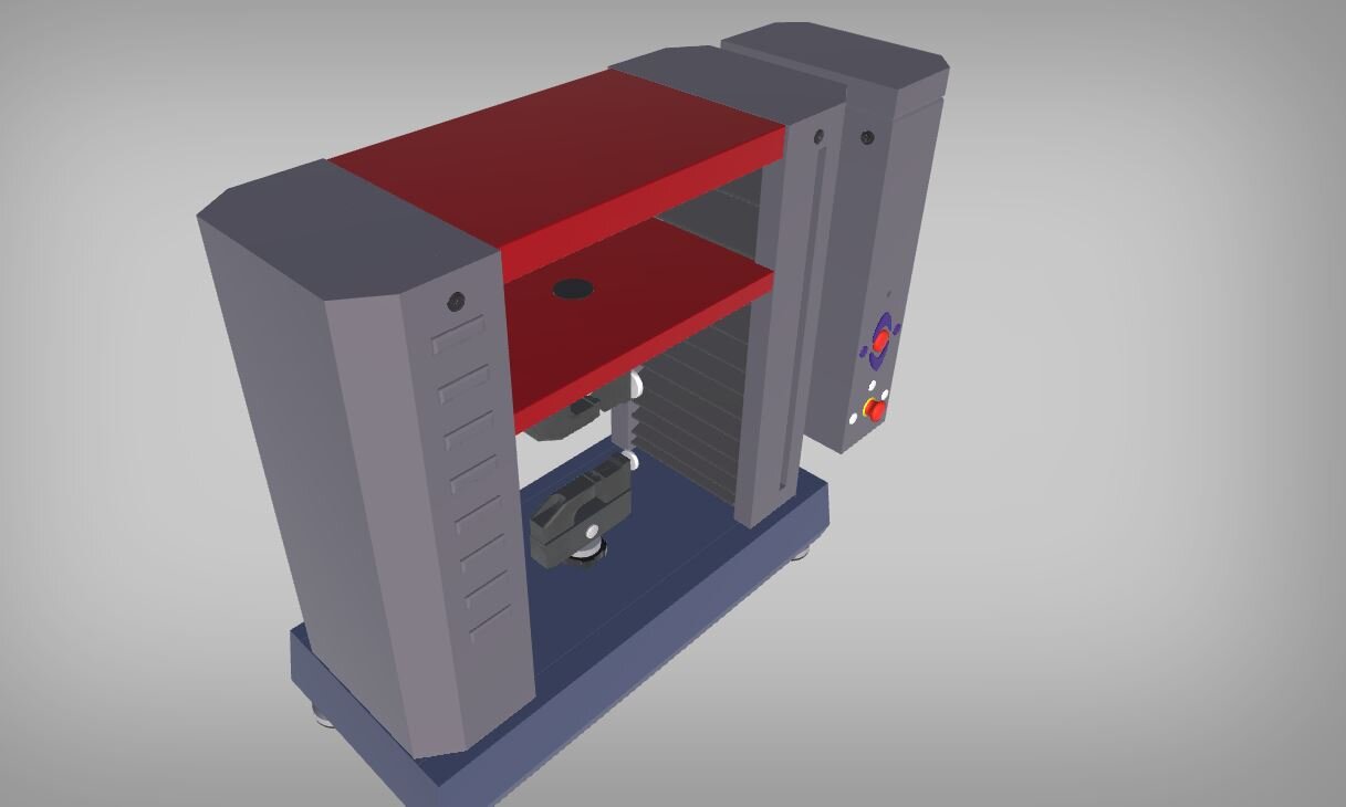Wizualizacja trzy de ukazuje zrywarkę pionową do oznaczania samozerwalności i rozciągliwości papieru. Umożliwia obserwację urządzenia z każdej strony, z perspektywy obserwatora obchodzącego obiekt wokół. Zrywarka pionowa do oznaczania samozerwalności i rozciągliwości zbudowana jest z dwóch kolumn, przez które aplikowana jest siła rozciągająca, układu szczęk oraz – jednej ruchomej i jednej nieruchomej oraz układu odczytowego. Kolumny są osadzone na stabilnej podstawie, zaś pomiędzy nimi znajdują się dwa poprzeczne elementy. Do jednego z nich przymocowana jest górna szczęka, dolna zaś została osadzona na podstawie. Po prawej stronie mieści się układ pomiarowy.