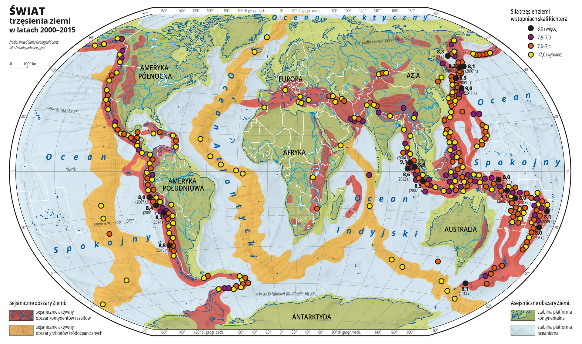 Znajdź na mapie miejsca (poza Islandią), w których występuje rozbieżny ruch płyt litosfery. Określ, czy występuje w nich intensywna aktywność wulkaniczna i trzęsienia ziemi.