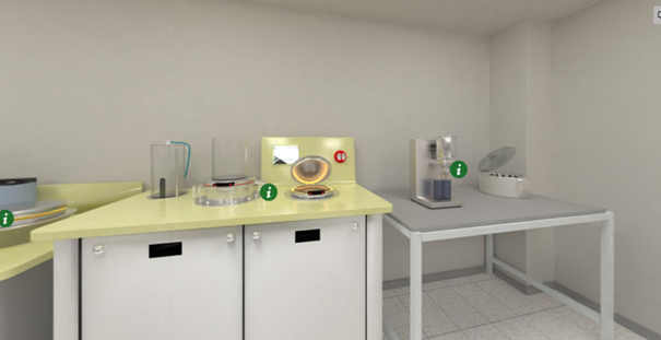 Pierwsze ujęcie przedstawia pomieszczenie ze stołami laboratoryjnymi i różnymi urządzeniami. Pierwsze dwa znaczniki umieszczone są na urządzeniu z dwoma blatami, pomiędzy którymi znajduje się element przypominający wieżę. Podpis znacznika pierwszego: Urządzenie do formowania i suszenia arkusików Rapid Kothen. Masa papiernicza wlewana jest od góry do „wieży”, w której jest formowana i wstępnie odwadniana. Uformowany arkusz jest dalej suszony w sekcji suszącej. Podpis znacznika drugiego: Urządzenie do formowania oraz suszenia laboratoryjnych arkuszy papieru. Trzeci znacznik umieszczony jest na urządzeniu z prostokątnym zbiornikiem i znajdującym się pod nim lejkiem. Pod lejkiem widać plastikowy cylinder miarowy. Podpis: urządzenie do mielenia masy do uzyskania określonej smarności. Czwarty znacznik umieszczony jest na urządzeniu z lejkiem, pod którym znajduje się cylinder z miarką. Podpis: Urządzenie do pomiaru smarności masy papierniczej (Schoppera‑Rieglera). Do naczynia z sitowym dnem wlewa się litr badanej masy o stężeniu dwie dziesiąte procenta. W chwili wlewania masy do naczynia sitowe dno jest zakryte stożkiem. Stożek podnosi się za pomocą przycisku zwalniającego – w tym momencie masa zaczyna odwadniać się na sicie. Woda przecieka do stożkowego zbiorniczka wyposażonego w dwa odpływy. W przypadku masy dobrze odwadnialnej woda spiętrza się w stożkowym zbiorniczku i wypływa głównie przez odpływ boczny do podstawionego specjalnie wyskalowanego cylindra. Masa silnie zmielona odwadnia się wolniej, dlatego woda nie spiętrza się w zbiorniczku i wypływa głównie odpływem znajdującym się u wierzchołka stożka. Smarność masy odczytuje się ze skali na cylindrze. Piąty znacznik umieszczony jest obok urządzenia składającego się z trapezowatej podstawy i walcowatej górnej części otwartej od góry. Podpis: Klasyfikator włókien. Klasyfikator włókien rozdziela pulpę na drobne frakcje włókien Maszyna składa się z pulsującej membrany i sita. Ciągły przepływ wody rozdziela frakcje bez uszkodzeń włókien oraz zmian w ich pierwotnych cechach. Wielkość włókien wpływa na właściwości mechaniczne oraz jakość papieru i tektury. Szósty, ostatni znacznik w tym ujęciu przedstawia urządzenia do oznaczania właściwości mas i wytworów papierniczych. Widoczne jest duże prostokątne urządzenie z wystającymi okrągłymi elementami na górze, które suszą uformowany arkusz papieru. Pośrodku znajduje się mniejsze urządzenie w kształcie płaskiej litery L.