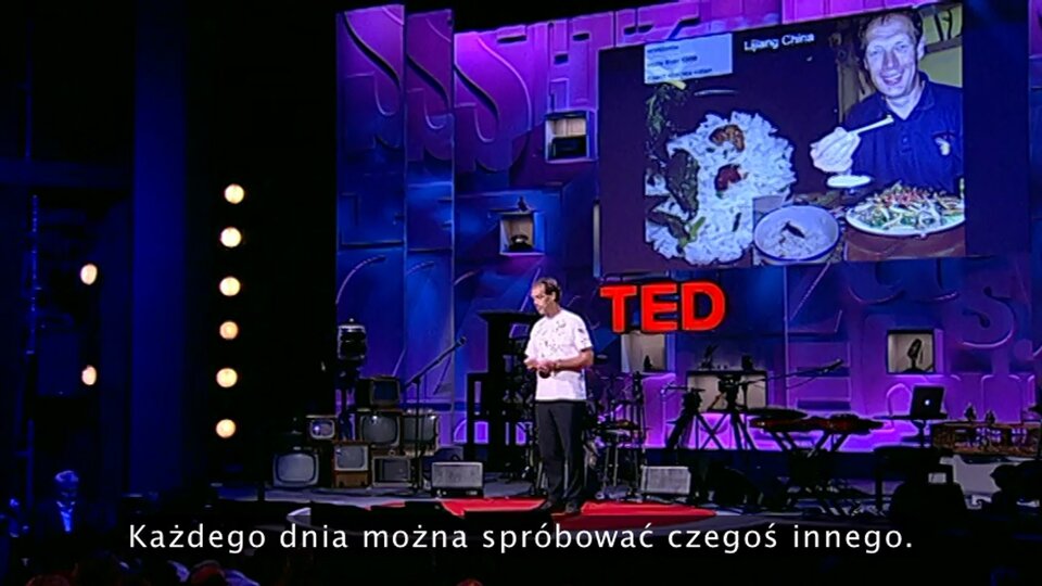 Film. Na filmie mężczyzna stoi na scenie, publiczność siedzi na widowni. Mężczyzna opowiada o tym, w jakich rejonach jada się owady i jakie są zalety takiego źródła pożywienia.