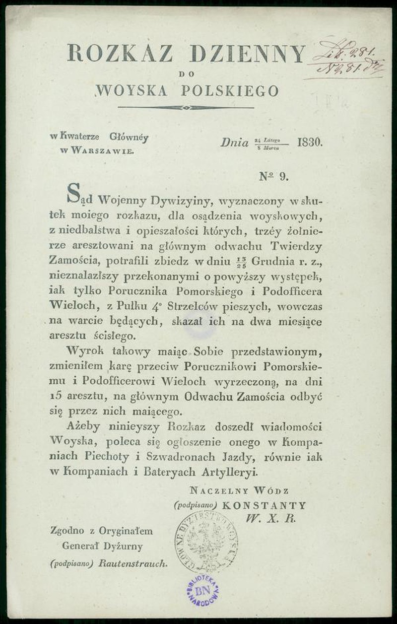 - Rozkaz dzienny do Woyska Polskiego. No 9, [Inc.:] Sąd Wojenny Dywizyiny, wyznaczony wskutek moiego rozkazu, dla osądzenia woyskowych [...] : w Kwaterze Głównéy w Warszawie dnia 24 Lutego/8 Marca 1830