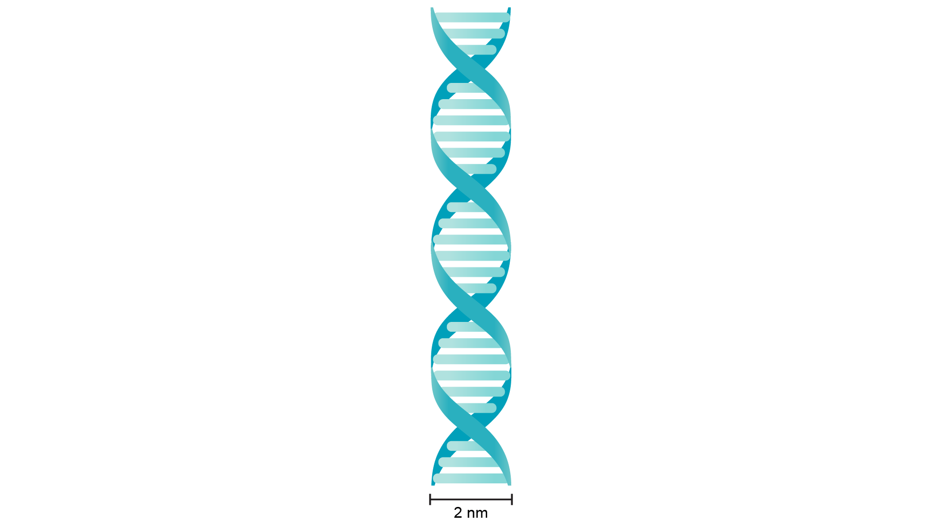 Każda cząsteczka DNA znajdującego się w jądrze komórkowym ma postać podwójnej helisy o szerokości 2 nm.