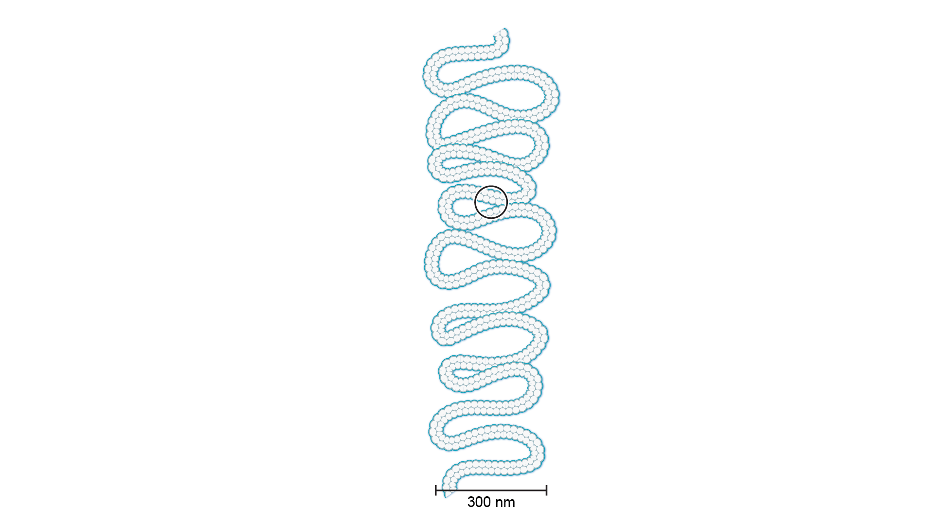 W wyniku spiralizacji solenoidu powstaje włókno o średnicy 300 nm z pętlami.