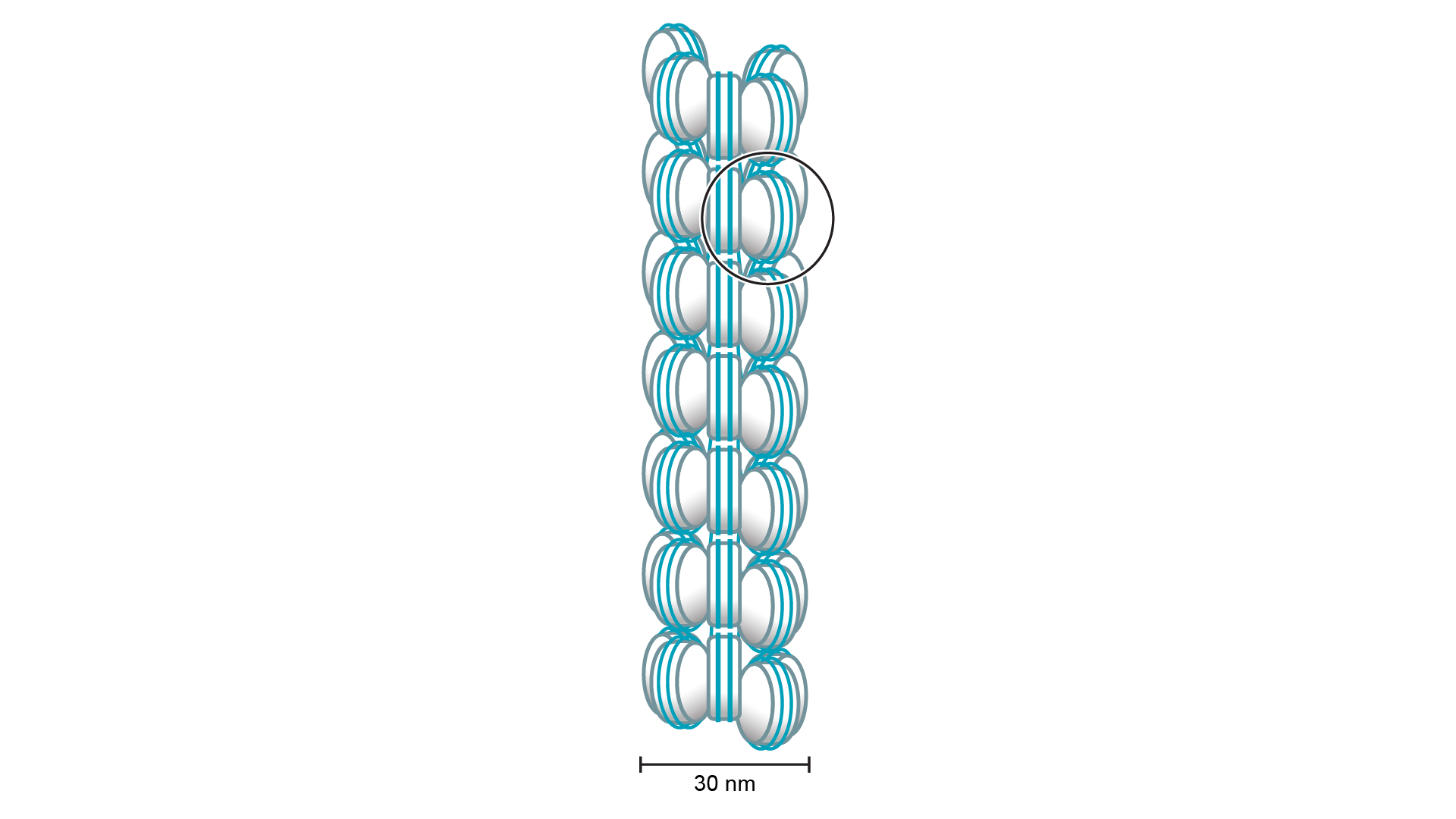 Solenoid, o średnicy 30 nm, jest połączonych zbudowany z nukleosomów, ze sobą za pomocą histonów i innych białek. Dzięki temu DNA zajmuje aż czterdzieści razy mniej miejsca niż przed upakowaniem!