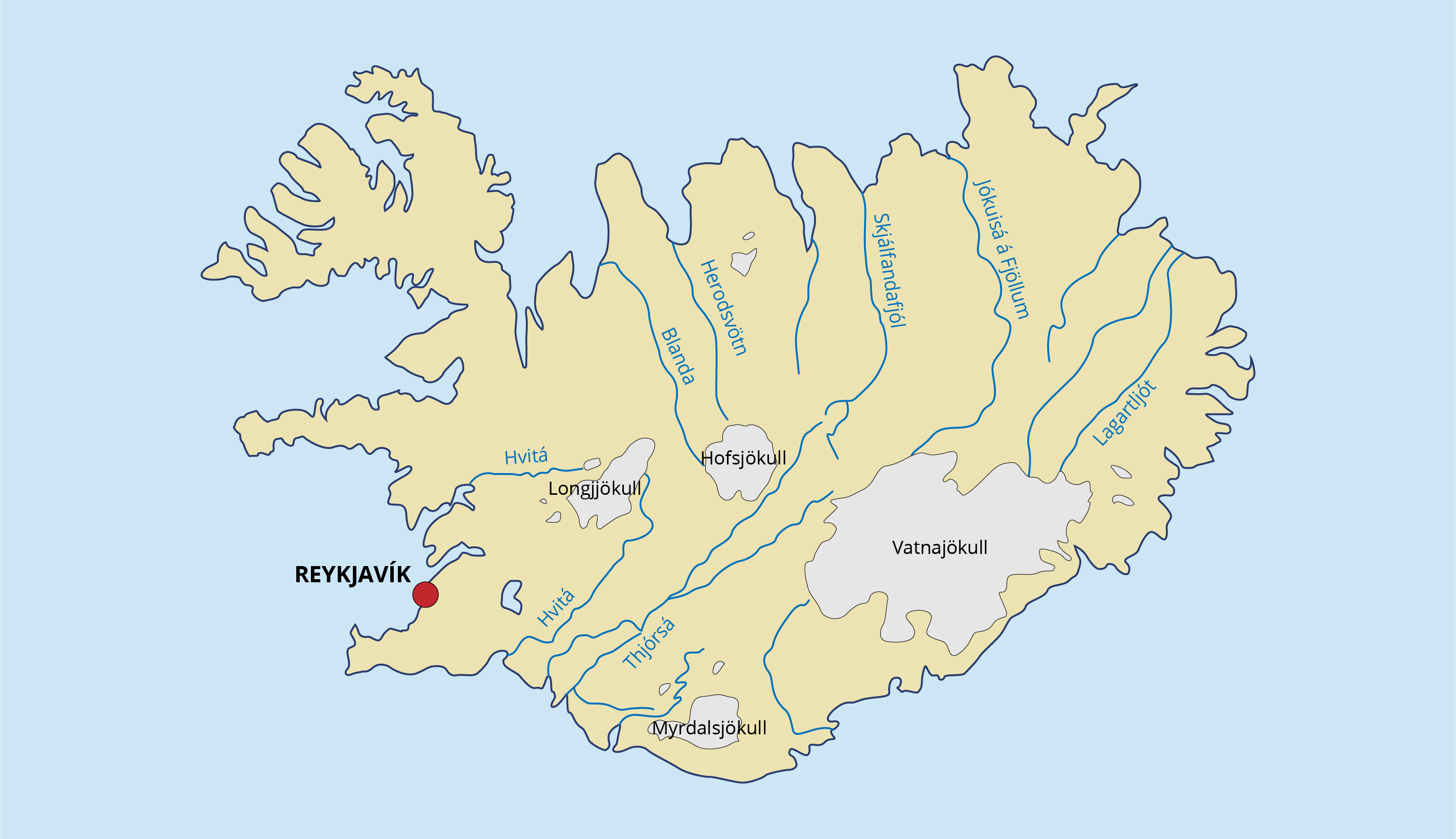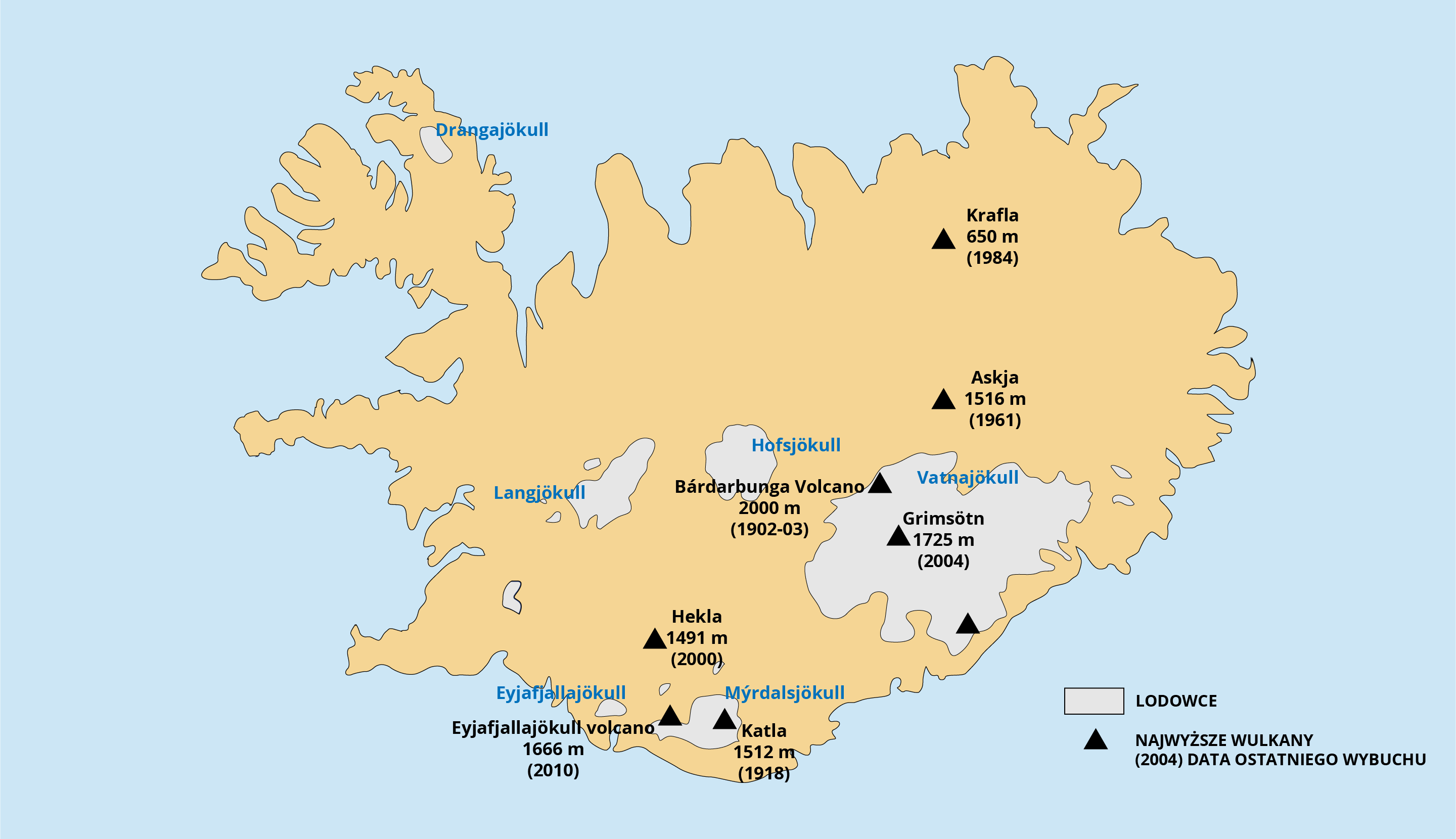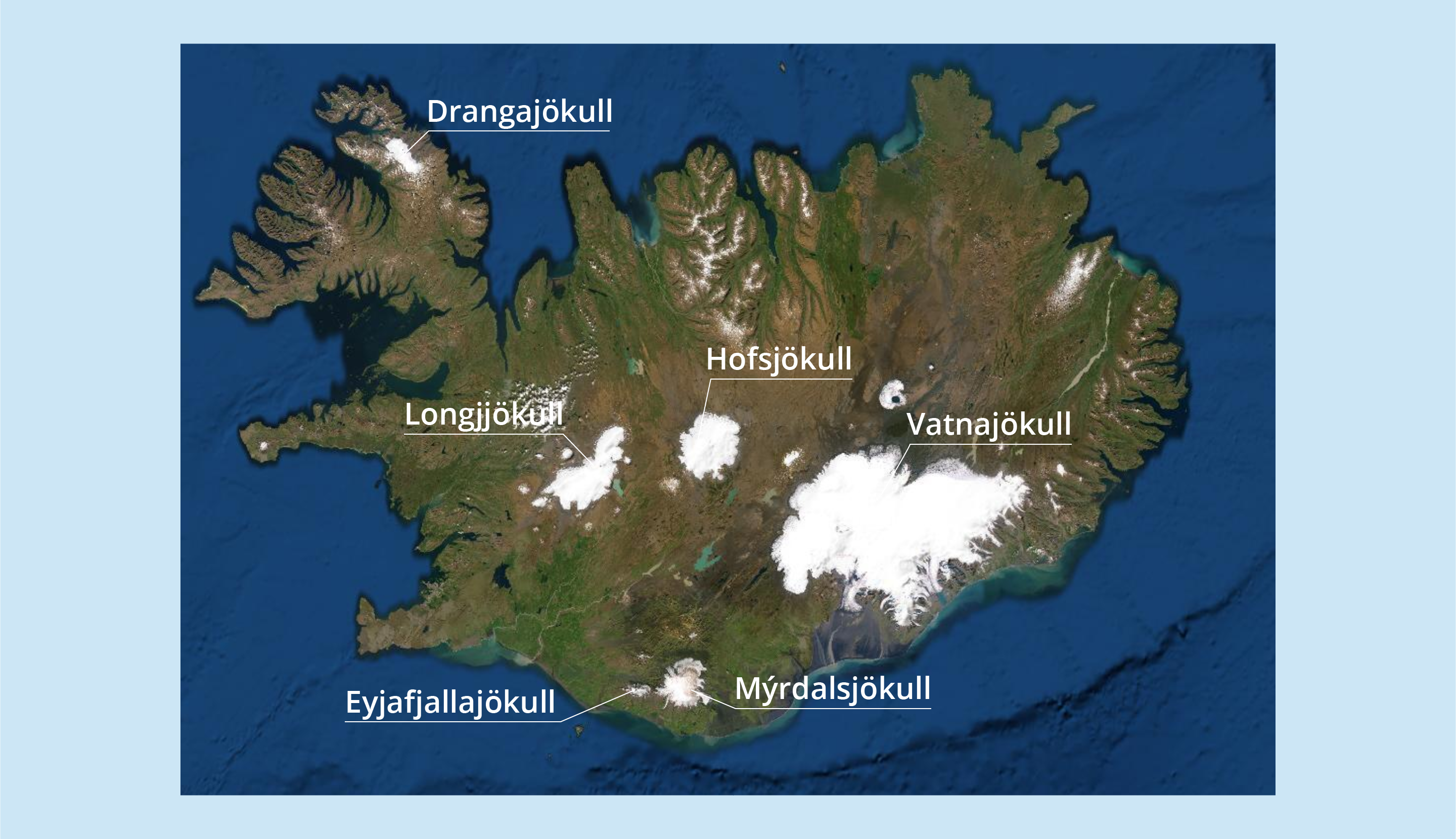 Słowo "Islandia" w języku mieszkańców tej wyspy oznacza Kraj Lodów. Patrząc na zdjęcie satelitarne tej wyspy, uwagę zwracają w pierwszej kolejności lodowce. W epoce lodowcowej niemal cała wyspa pokryta była lodem. Dzisiaj lodowce stanowią tylko w 11% jej powierzchni. Na Islandii znajduje się największy lodowiec Europy – Vatnajökull [czyt. watnajokutl], o powierzchni 8,3 tys. km2. Słowo “jökull” [czyt. jokutl] oznacza lodowiec, dlatego też pojawia się w nazwie każdego z nich.