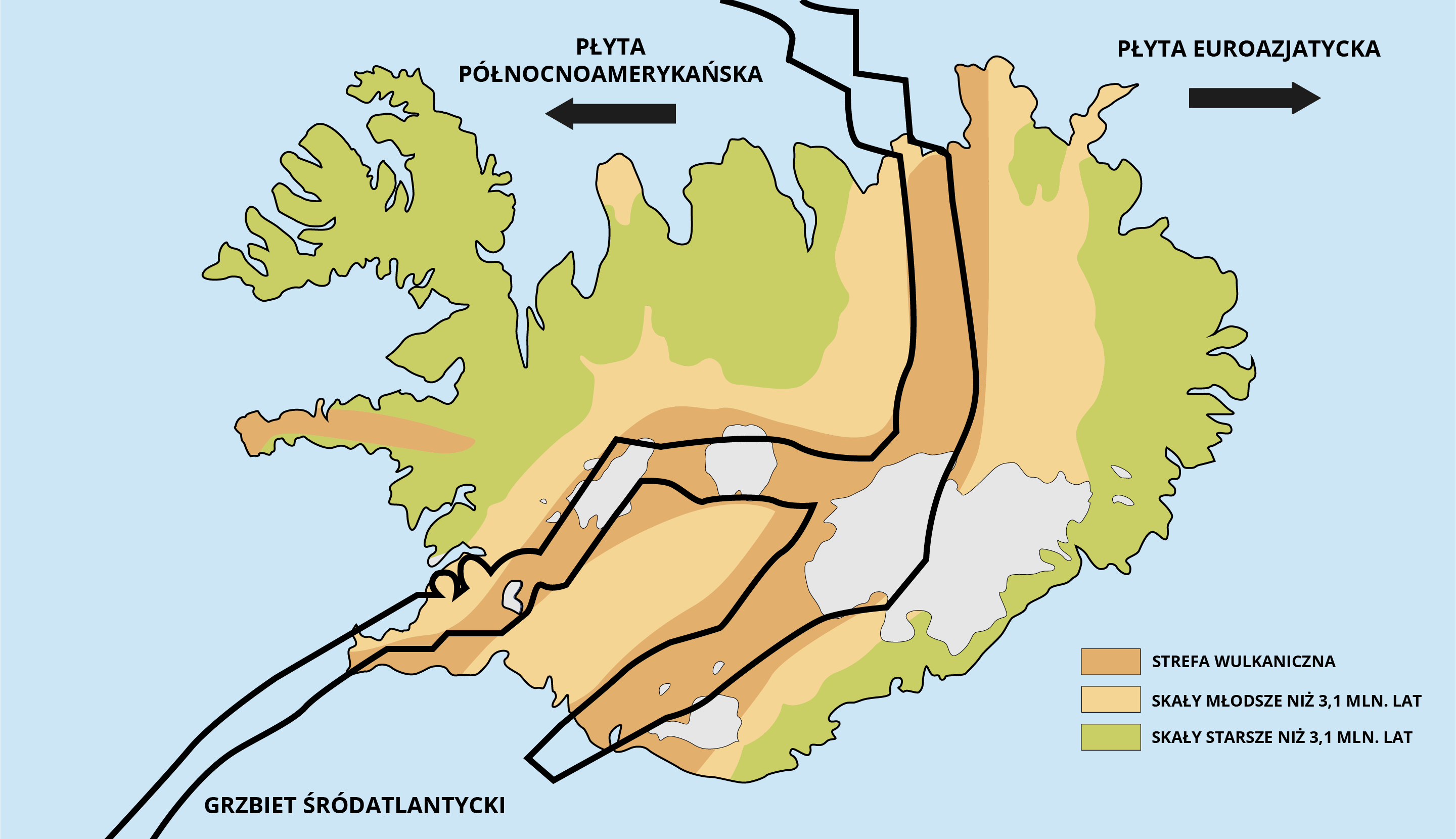 Przez Islandię przebiega granica rozbieżna między płytą północnoamerykańską i eurazjatycką. Jest to nietypowa sytuacja, gdyż większość obszarów rozsuwania się płyt litosfery znajduje się na dnie oceanów, tworząc grzbiety śródoceaniczne. Jeden z takich grzbietów ciągnie się przez środek Atlantyku, z północy na południe (Grzbiet Śródatlantycki). Islandia jest fragmentem tego grzbietu, który wystaje ponad powierzchnię oceanu. Powstała on w wyniku wypływania lawy przez ryft, co miało miejsce przez wiele milionów lat. Jest ona zatem zbudowana z zastygłej lawy. Przez te lata rozrastała się ona od środka, zatem wiek skał budujących Islandię rośnie wraz z oddalaniem się od strefy ryftowej. Wyspa ta jest zatem aktywna geologicznie, a pod jej powierzchnią występuje wysoka temperatura.
