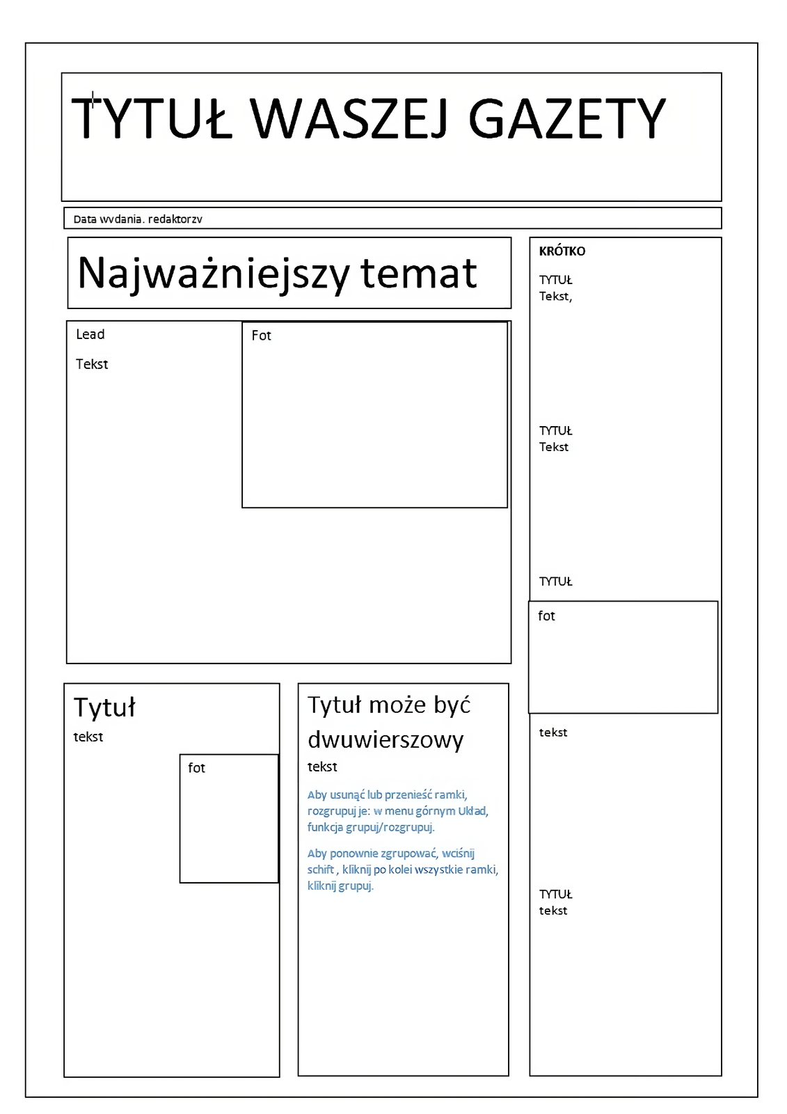 Zaplanuj treści na pierwszą stronę gazety. Napisz kilka krótkich informacji prasowych dotyczących bieżących wydarzeń ze świata, kraju, życia szkoły.