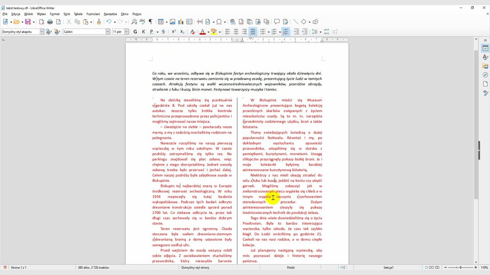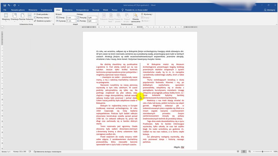 Na zrzucie ekranu ukazany jest tekst, który opisuje wycieczkę szkolną na festyn archeologiczny w Biskupinie. Napisany jest przez Magdę z klasy VI d. Wstęp napisany jest w kolorze czarnym. Przebieg wycieczki zapisano kolorem czerwonym. Tekst czerwony podzielony jest na dwie kolumny, które oddzielone są pionową linią.