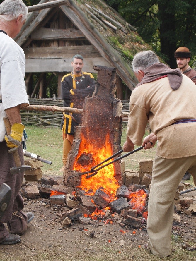 Załącznik to zdjęcie, które należy wstawić w plik tekstowy: "Wycieczka.rtf". Fotografia przedstawia ognisko i ludzi zgromadzonych wokół. Jeden z mężczyzn za pomocą długich szczypiec, unosi nad ogniskiem stalowy element. Prawdopodobnie jest to kowal.