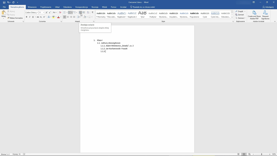 Jeśli chcesz powrócić z dowolnym punktem na wyższy poziom, zaznacz go i zastosuj polecenie Zmniejsz wcięcie lub ustaw kursor tekstowy na początku akapitu i użyj jednocześnie klawiszy Shift + Tab.