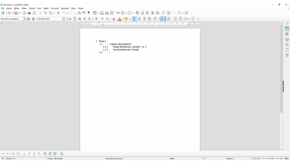 Za pomocą polecenia Numerowanie (w programie LibreOffice WriterWłącz numerację) utwórz numerowaną listę jednopoziomową.