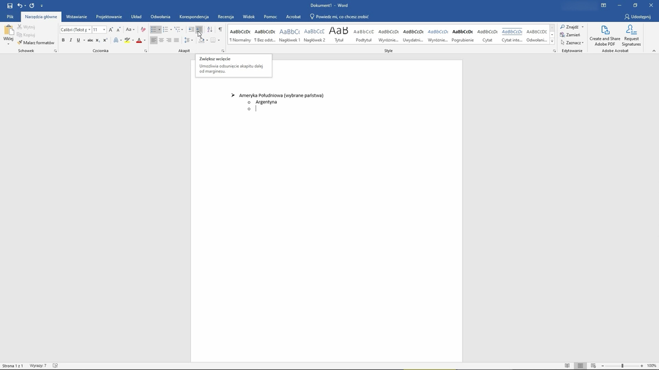 Jeśli chcesz utworzyć podpunkt dla danego punktu, użyj klawisza Tab lub zastosuj polecenie Zwiększ wcięcie.
