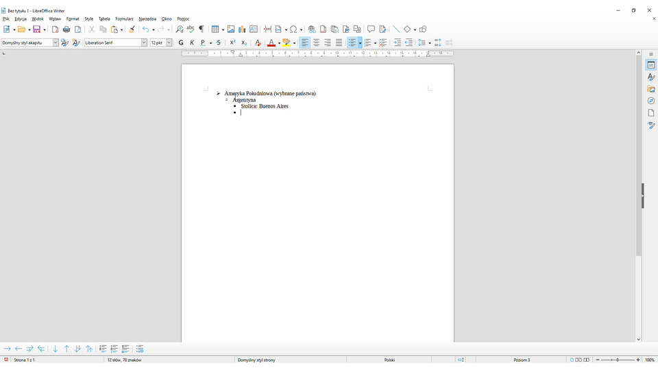 Za pomocą polecenia Punktory (w edytorze LibreOffice Writer Włącz wypunktowanie) utwórz punktowaną listę jednopoziomową.