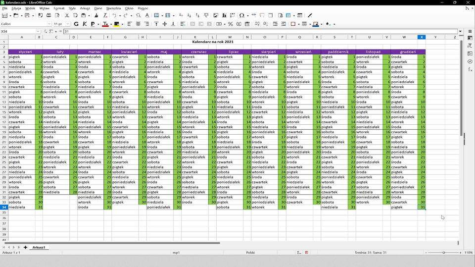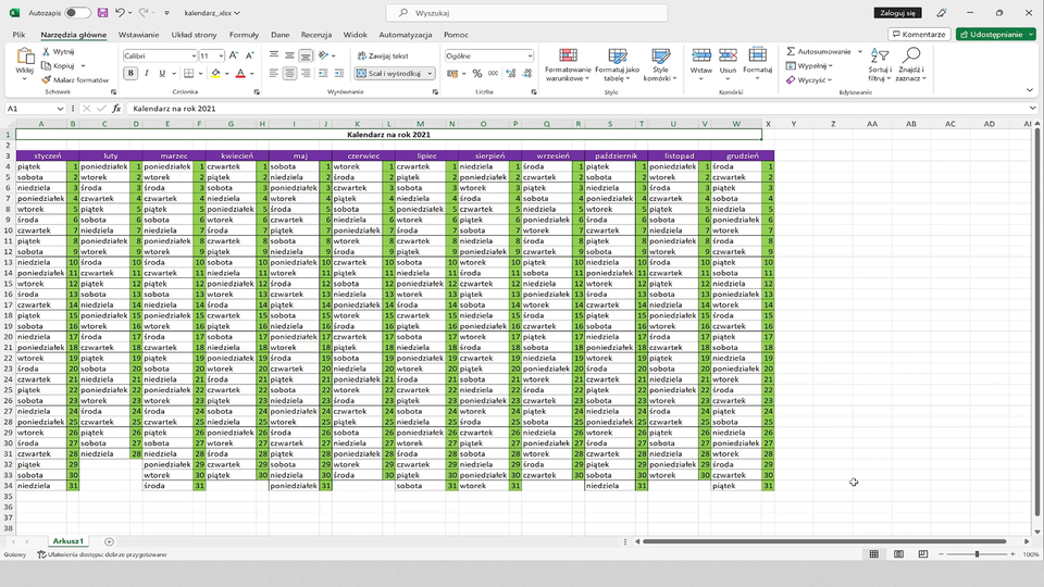Arkusz kalkulacyjny - kalendarz