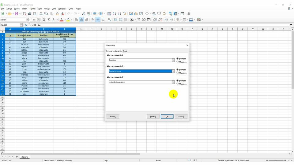 Tabela, dostępna do pobrania poniżej, prezentuje rodzaje drzew występujących w Polsce i rodzin, do których te drzewa należą. Dane w tabeli posortuj rosnąco według rodzajów drzew, a następnie według ich rodzin.