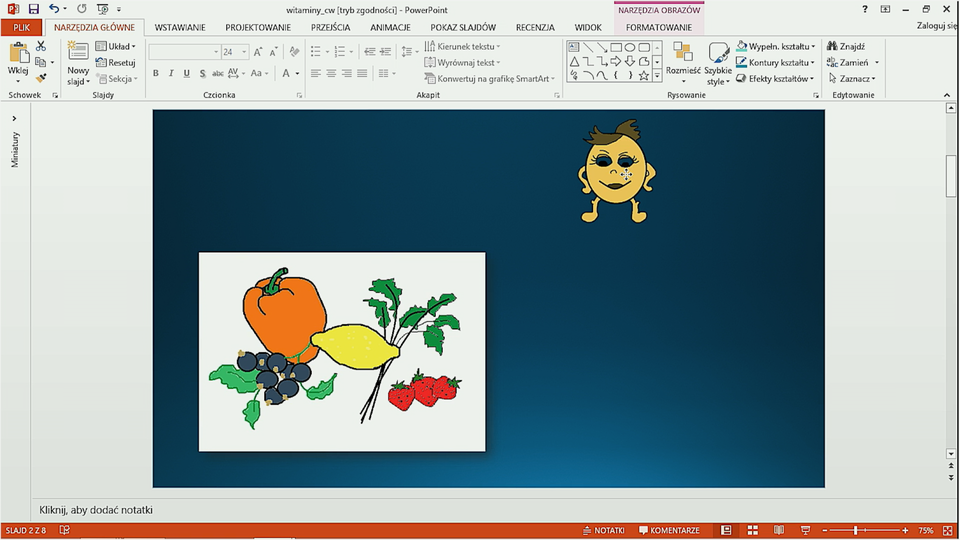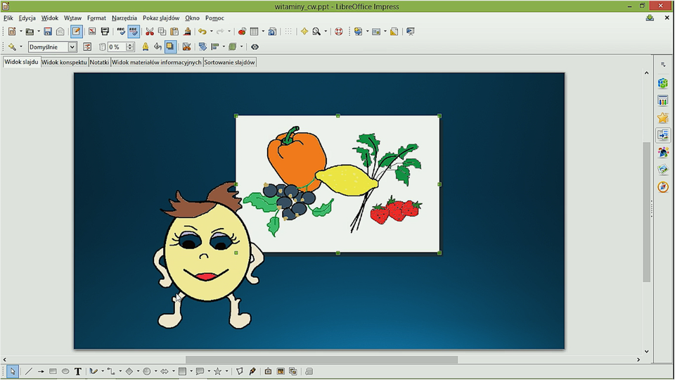 W przykładowej prezentacji „Witaminy i minerały w mojej diecie” na slajdzie został wstawiony własny rysunek zapisany w komputerze.