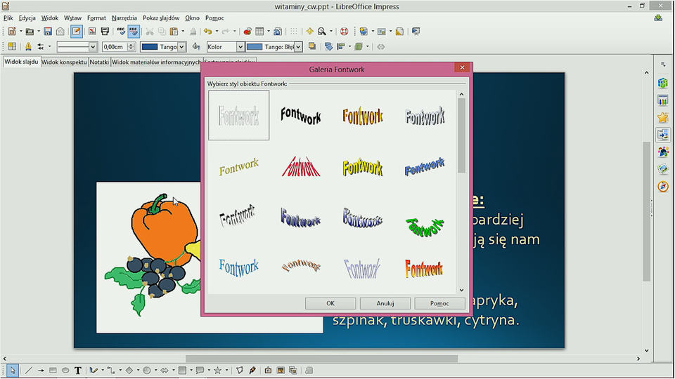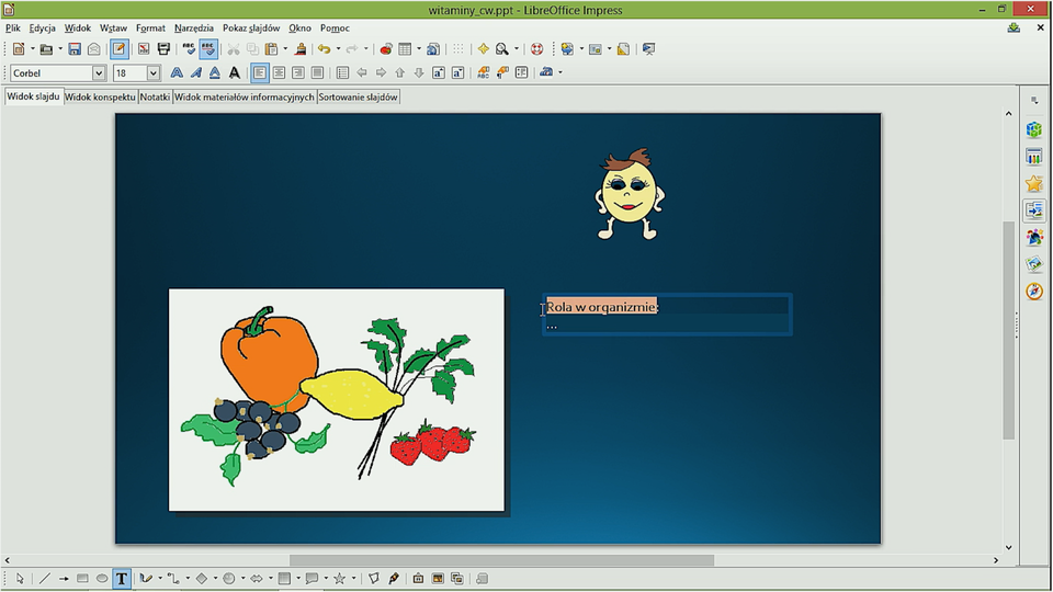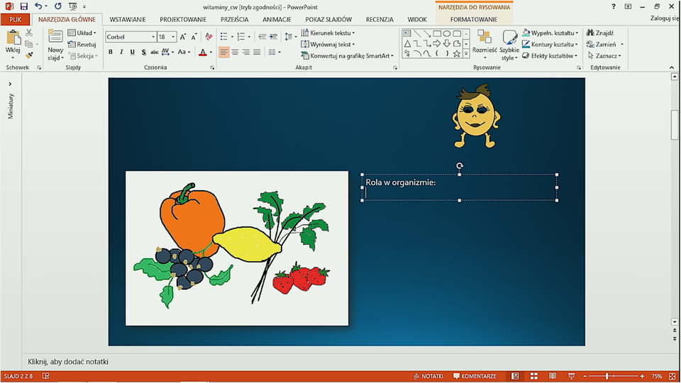 W przykładowej prezentacji na slajdzie zostało wstawione pole tekstowe, w którym wpisano i sformatowano tekst o wybranej witaminie.