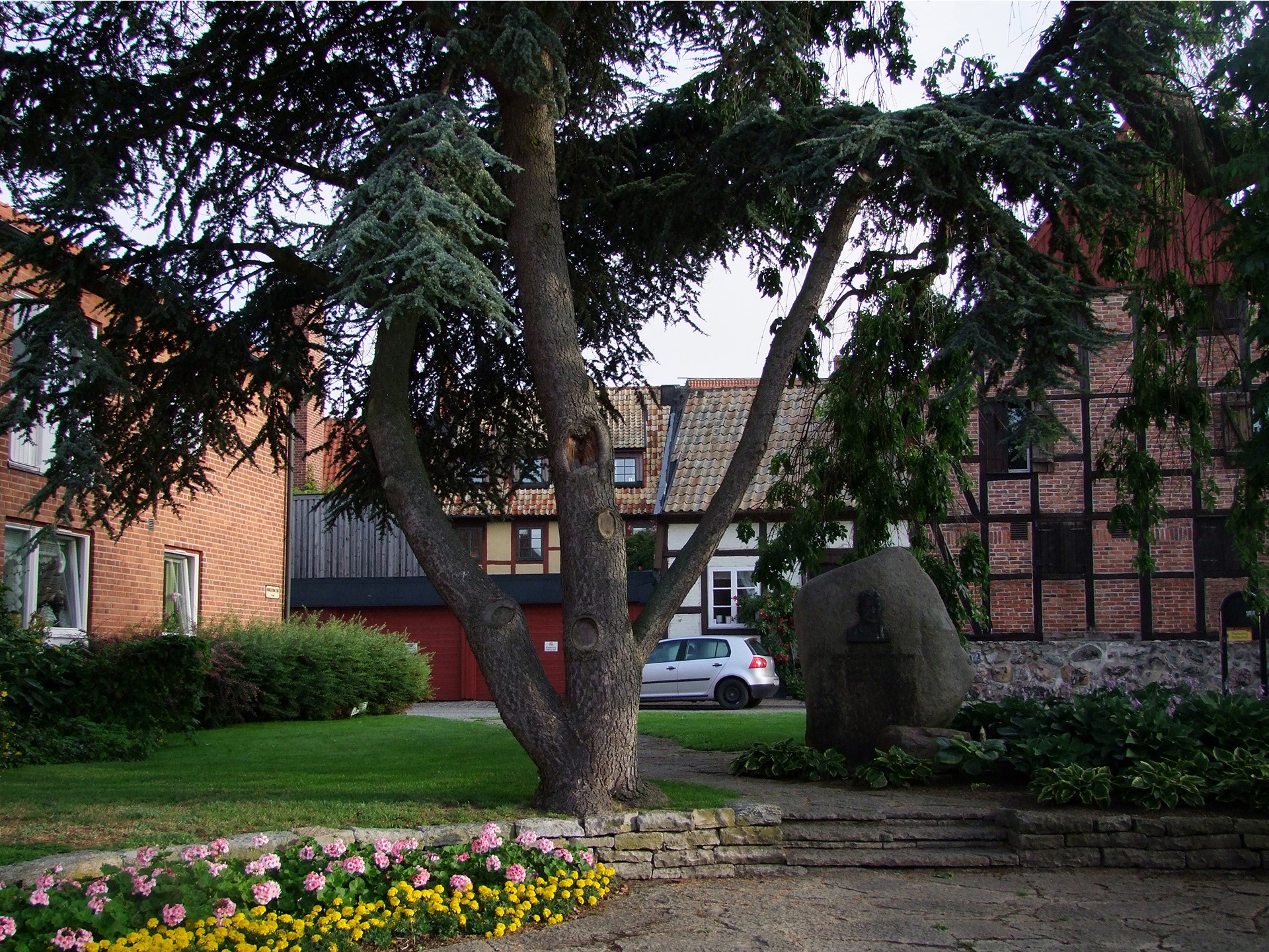 Plik do pobrania zawierający fotografię drzewa przy pomniku w miejskim parku. Opis alternatywny pliku graficznego: Fotografia przedstawia duże drzewo iglaste, którego pień tworzy trzy główne konary. Drzewo znajduje się tuż przy pomniku upamiętniającym w formie skały. Z przodu fotografii można dostrzec rabatę z różowymi i żółtymi kwiatami. Podłoże wyłożone jest kamiennymi płytkami. W tle widać liczne budynki mieszkalne oraz zaparkowany samochód.