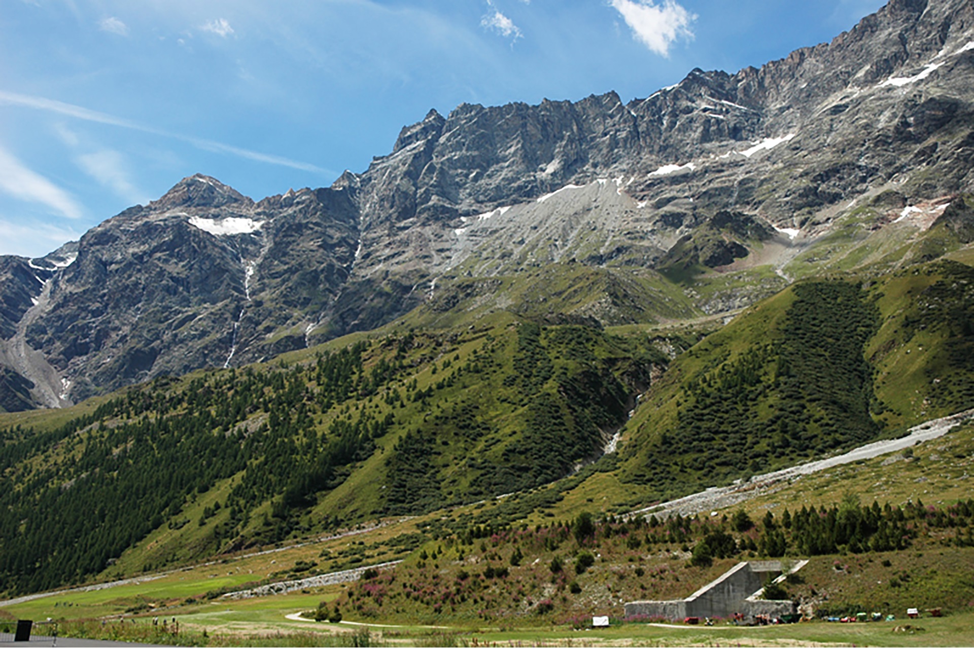 Plik do pobrania zawierający fotografię przedstawiającą część pasma górskiego Alp. Opis alternatywny pliku graficznego: Fotografia przedstawiająca lewy kraniec pasma górskiego Alp. Szczyty pokryte są śniegiem, natomiast dolne części gór porośnięte są niską roślinnością oraz krzewami iglastymi w intensywnym zielonym kolorze. U podnóża gór znajduje się ulica, po której jadą samochody. Niebo nad górami jest błękitne, prawie bezchmurne. Przy drodze znajduje się mały drewniany budynek, a tuż obok niego umiejscowiona jest wysoka latarnia.