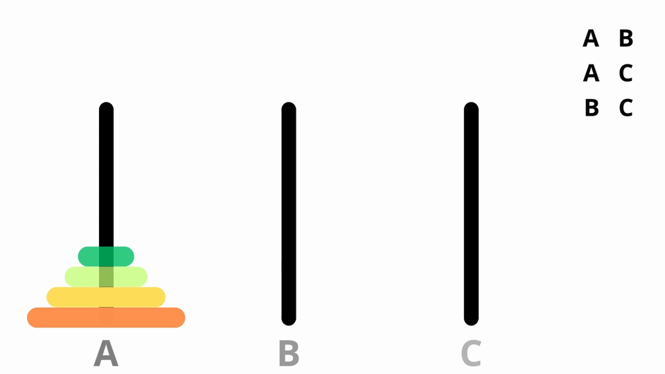 Zwróć uwagę na oznaczenia aaa, abb itd. Składają się one z trzech liter, pierwsza odpowiada pierwszemu krążkowi, druga odpowiada drugiemu krążkowi, trzecia odpowiada trzeciemu krążkowi. Litera a odpowiada pierwszemu stosowi, litera b odpowiada drugiemu stosowi, a litera c odpowiada trzeciemu stosowi. Zatem oznaczenie acc oznacza, że pierwszy krążek znajduje się na stosie a, a krążki drugi i trzeci na stosie c.