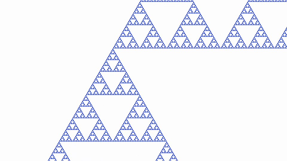 W animacji przedstawiono trójkąt Sierpińskiego. Zwróć uwagę na strukturę fraktalu na różnych poziomach przybliżenia. Wykazuje ona samopodobieństwosamopodobieństwo i powtarza się rekurencyjnierekurencyjnie.