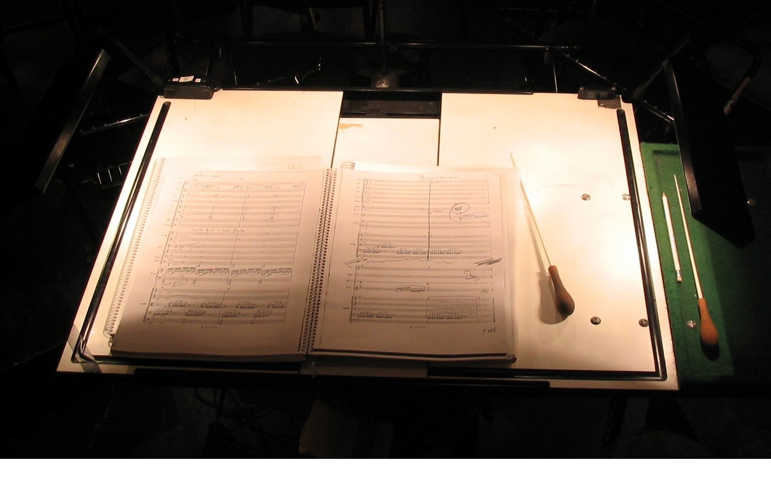 Ilustracja przedstawia partyturę i batutę. Po prawej stronie jest ołówek i duga batuta.