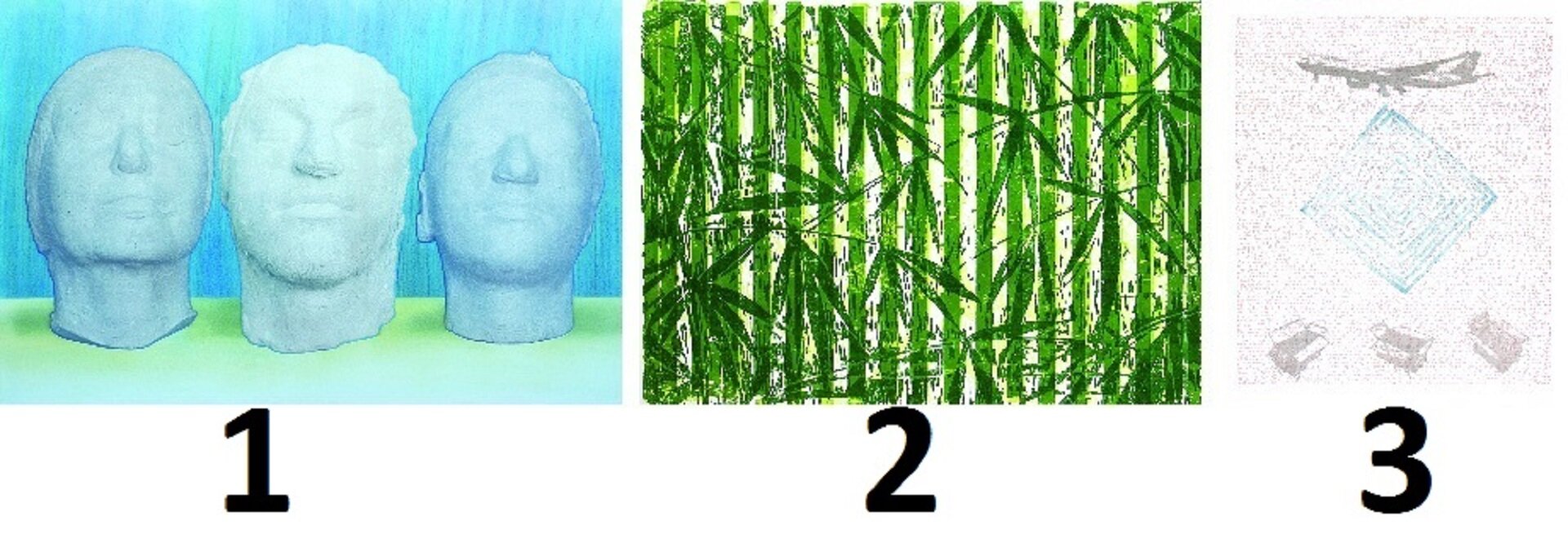 Ilustracja ukazuje trzy kobiety o ciemnych, spiętych w kok włosach. Pozbawione rąk postacie ubrane są w jasno‑niebieskie suknie z tiulowymi spódnicami. Zwrócone są w prawą stronę. Na niebieskim tle znajdują się płasko malowane fragmenty kadrów z postaciami i powtarzającym się portretem tej samej dziewczyny. Praca namalowana została swobodną, szeroką plamą. Kobiety przedstawione są z dużym uproszczeniem. Artystce nie zależy na wiernym uchwyceniu rzeczywistości, stara się jedynie przekazać nastrój ukazanej sceny. Obraz utrzymany jest w chłodnej, błękitnej gamie barw. Na ilustracji umieszczony jest aktywny punkt, po wybraniu którego wyświetli się dodatkowa informacja: 1.