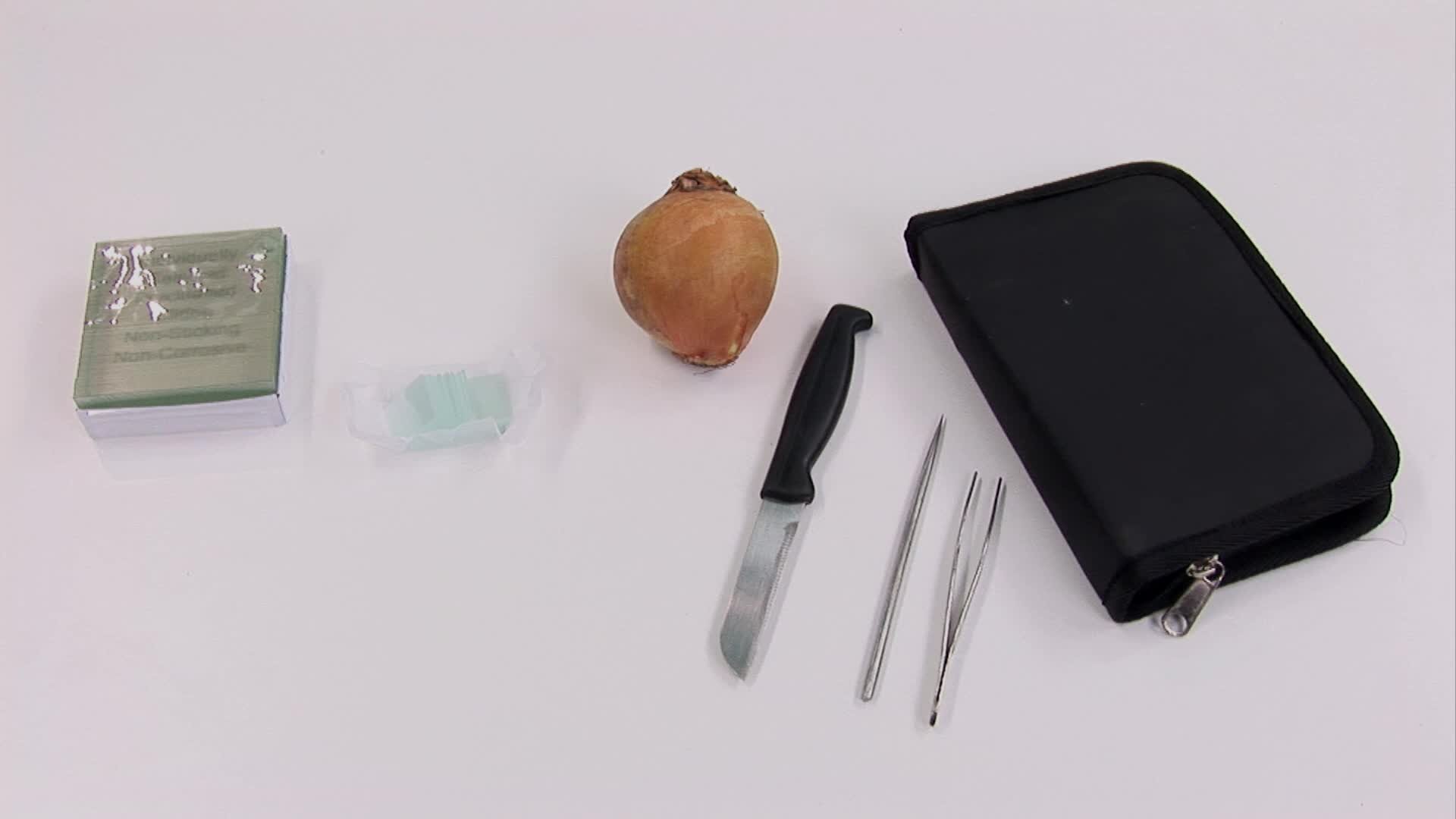 Podziel cebulę na łuski. Z wewnętrznej strony łuski zdejmij igłą fragment skórki, która wygląda jak półprzezroczysta folia. Umieść skórkę w kropli wody na szkiełku podstawowym.