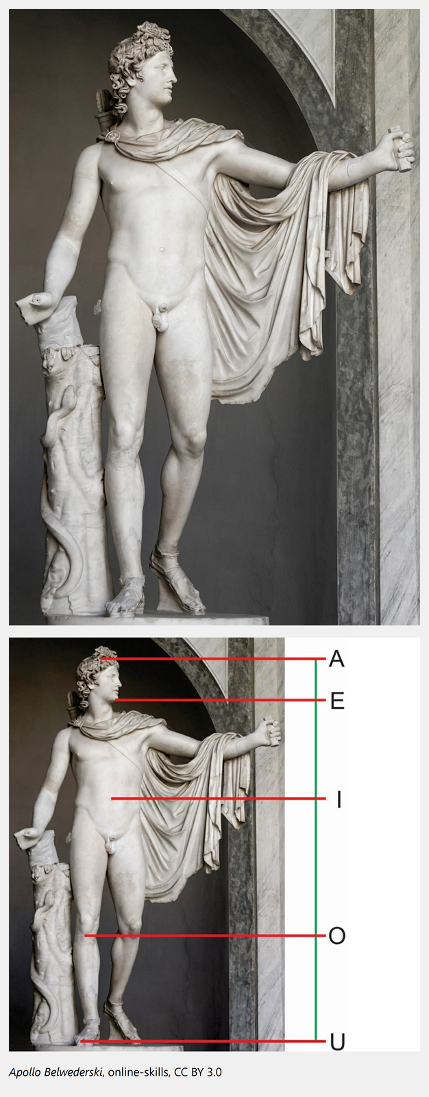 Znanym dziełem starożytnym, które ilustruje zasadę złotego podziału, jest rzymska rzeźba pochodząca z II wieku, będąca kopią rzeźby greckiego artysty Leocharesa. Klikając na ilustrację interaktywną, zobaczysz, w jaki sposób artysta odniósł się do kanonu złotego podziału.