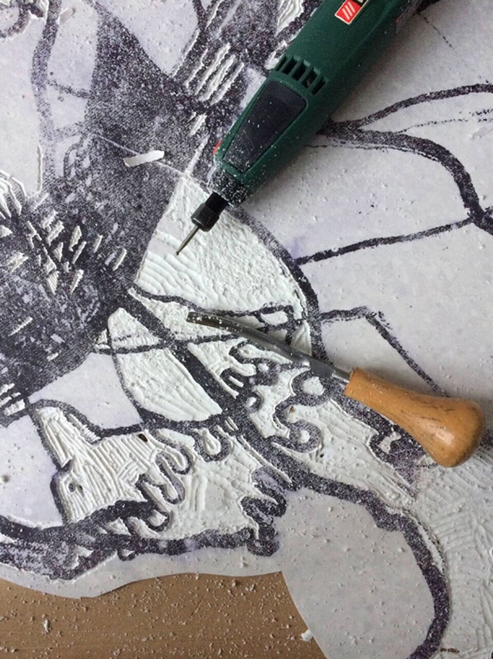 Fotografia przedstawia stanowisko pracy oraz dłonie kobiety, która przy nim stoi. W prawej dłoni kobieta trzyma wałek o czerwonym trzonie, który został zanurzony w czarnej substancji. Kobieta, której paznokcie pomalowane są na czerwono, przeciąga wałek po wzorniku, zamalowując jego powierzchnię w czarne pasy. Ma na sobie fartuch w pasy. Po lewej stronie, na blacie przypominającym kamień leżą dwa narzędzia, różniące się stopniem zużycia, przypominające dłuta o cienkich zakończeniach i małych, drewnianych trzonach.