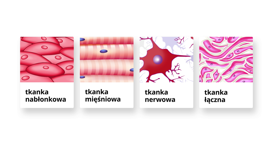 W organizmie człowieka występują 4 rodzaje tkanek: nabłonkowa, mięśniowa, nerwowa, łączna.
