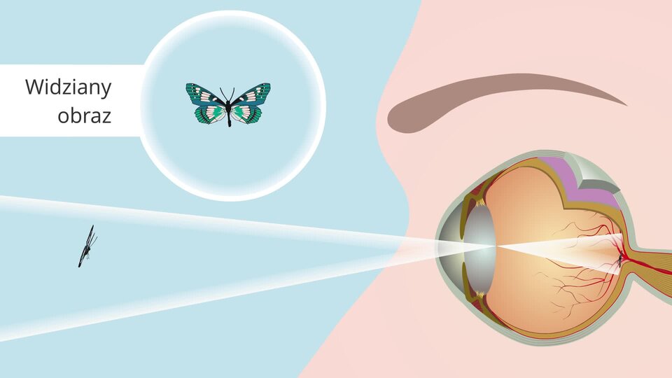 W dalekowzroczności gałka oczna jest za krótka. Promienie świetlne są skupiane za siatkówką. Aby skorygować tę wadę należy zastosować soczewki dwuwypukłe.