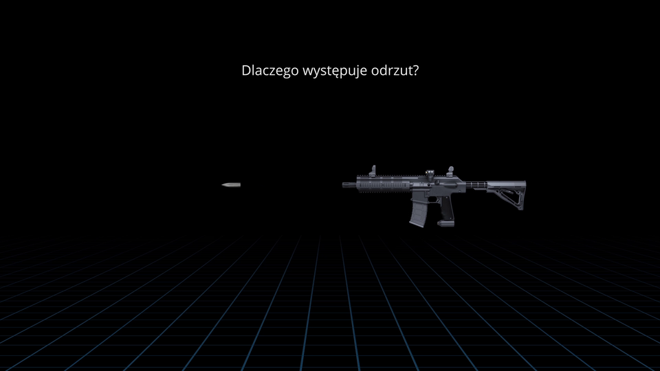 Animacja przedstawia zasadę zachowania pędu. Animację rozpoczyna czarny slajd tytułowy, na którym po środku umieszczono, dużymi literami, biały napis „JAK BRZMI ZASADA ZACHOWANIA PĘDU?”. Następnie rozpoczyna się film animowany, na którym przedstawiono, na czarnym tle, karabinek automatyczny. Karabin wystrzeliwuje poziomo w lewo pocisk a sam ulega odrzutowi poziomo w prawo z dużo mniejszą prędkością. Przedstawione jest to dwa razy a za drugim razem wrysowano na pocisk i karabin czerwone wektory ich pędów. Pęd pocisku skierowany w lewo został oznaczony jako: m małe razy v z indeksem dolnym p. Pęd karabinu skierowany w prawo został oznaczony jako: M duże razy v z indeksem dolnym k. Oba te pędy mają tą samą wartość i kierunek ale przeciwne zwroty. Następnie czerwone wektory pędów zastępują zielone wektory prędkości. Wektory te mają te same kierunki i przeciwne zwroty a prędkość pocisku ma dużo większą wartość niż prędkość karabinu.