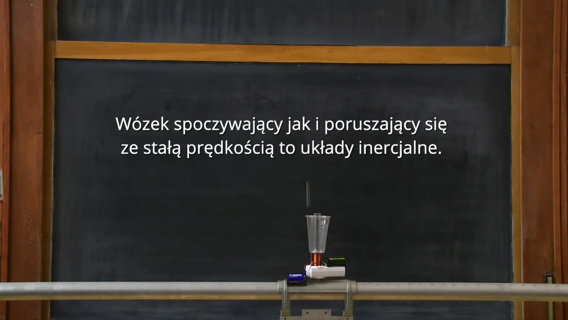 Film przedstawia nagranie eksperymentu z torem powietrznym. Na torze znajduje się wózek, a na nim – kulka przytrzymana ściśniętą sprężyną. Uwolnienie sprężyny prowadzi do wystrzelenia kulki. Eksperymentator przeprowadza doświadczenie dwukrotnie – dla wózka w ruchu i w spoczynku. Obejrzyj film. Zwróć uwagę na wyjaśnienie zaobserwowanego zjawiska na gruncie zasady Galileusza.