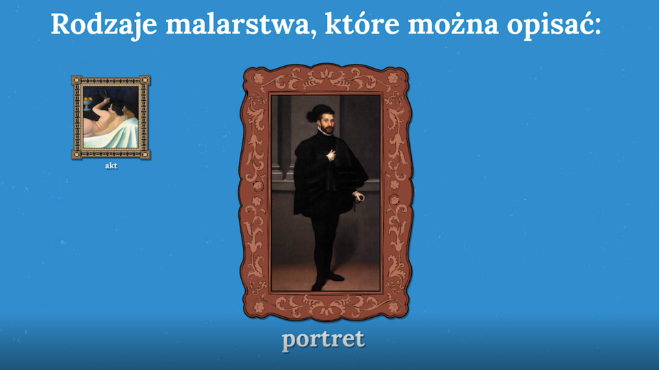 Animacja prezentuje, w jaki sposób opisać obraz. Zostały przedstawione różne rodzaje malarstwa, np. akt, portret, weduta, marina, batalistyka. Następnie został zaprezentowany schemat opisu obrazu z zachowaniem trójdzielnej kompozycji: wstęp, rozwinięcie i zakończenie.