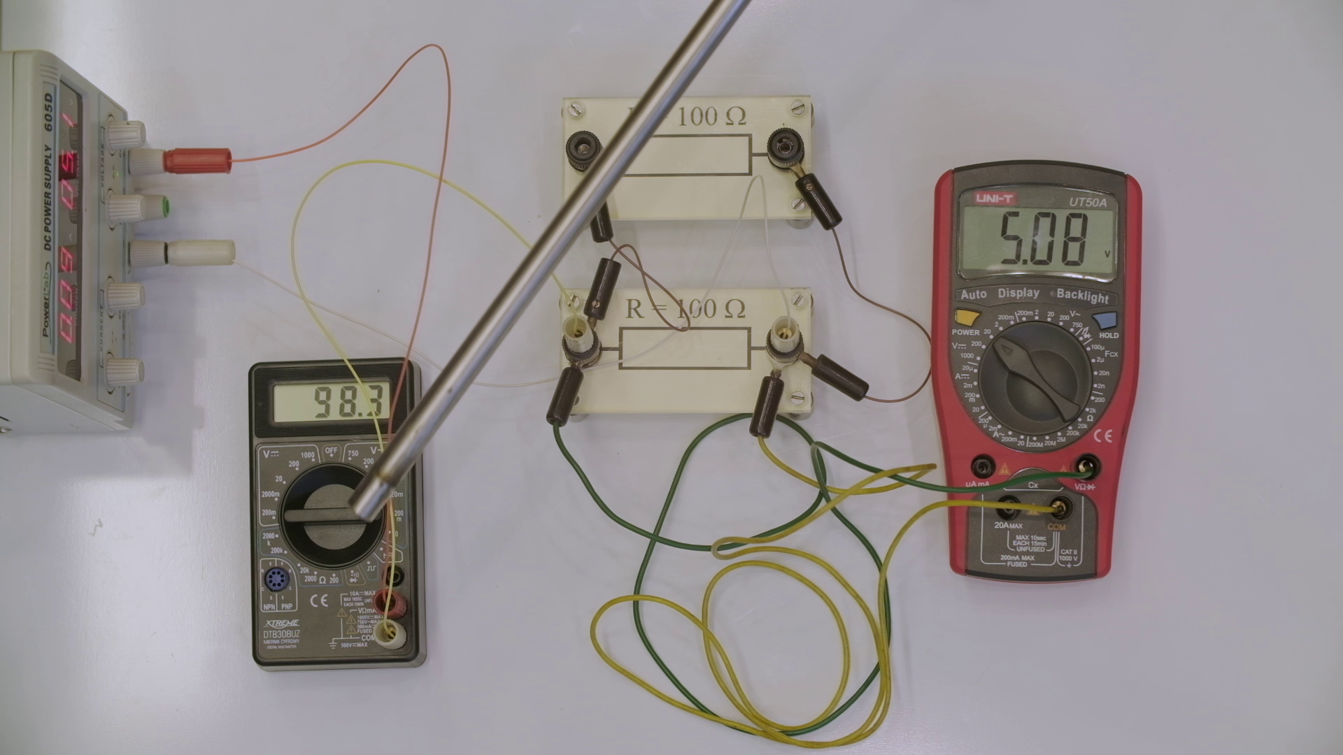 Część I. Na filmie pokazano przykłady różnych obwodów elektrycznych. Trzy z nich pokazują, jak zmienia się natężenie prądu płynącego w obwodzie przy różnym połączeniu oporników, zaś dwa pozostałe ilustrują własności diody.