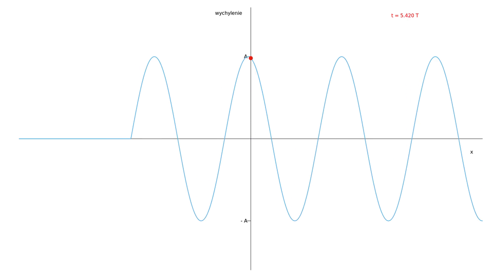 Film przedstawia ruch punktu w kolejnych fazach jednego okresu. W pierwszej chwili widoczny jest wykres. Na osi poziomej odłożono odległość x. Na osi pionowej odłożono wychylenie w zakresie od minus duże A do duże A. W środku układu współrzędnych znajduje się czerwony punkt, z początku nieruchomo. Funkcja ma kształt sinusoidy. Gdy film się rozpoczyna wykres pojawia się z lewej strony i zmierza w prawą. Przechodzi przez punkt przecięcia osi i w tym momencie czerwony punkt zaczyna przesuwać się po sinusoidzie. Podąża on raz w górę raz w dół, w zależności od tego jak zmienia się amplituda. Jednocześnie w prawej górnej ćwiartce układu współrzędnych wyświetla się czerwony napis małe t równa się wartość duże T. W trybie ciągłym podczas odtwarzania filmu napis ten wizualizuje czas trwania z dokładnością do trzech miejsc po przecinku. Na początku jest to zero okresów a na sam koniec filmu 9,180 duże T.