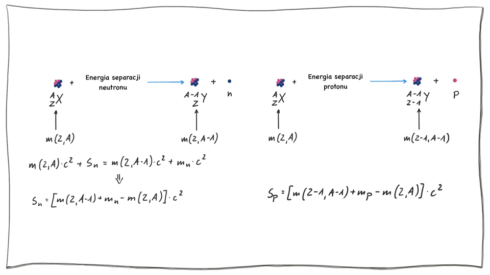 W filmie pokazana jest metoda obliczania energii separacji neutronu, czyli energii, którą należy dostarczyć do jądra atomowego, aby oderwać od niego jeden neutron. Energie separacji protonu i neutronu różnią się od siebie, dlatego dla danego jądra podaje się dwie wielkości.