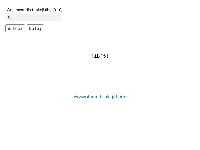 Wykorzystanie mechanizmu rekurencji do rozwiązania tego problemu jest nieefektywne. Funkcja będzie wielokrotnie obliczać te same wartości, z każdym wywołaniem fib(n) licząc od nowa wartości fib(n - 1) i fib(n - 2). Zwróć uwagę, ile razy dla wywołania fib(5) zostanie policzona wartość fib(2). Funkcję zaprezentowano tylko w celu wyjaśnienia rekurencji. Nie należy jej stosować do wyznaczenia wyrazów ciągu Fibonacciego.