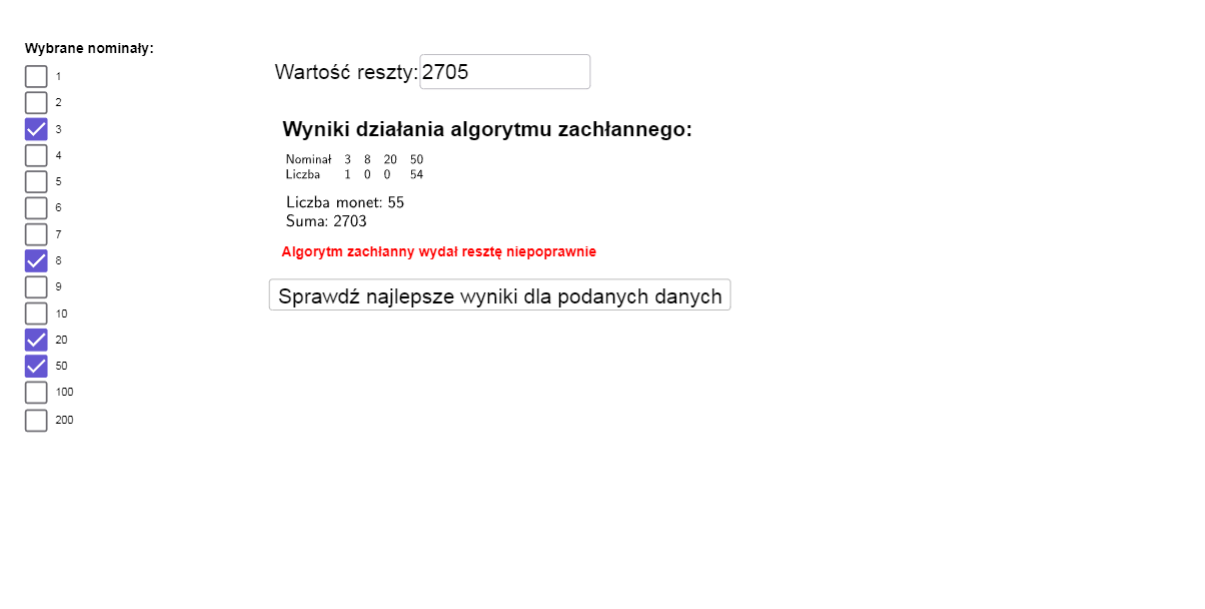 Aplet przedstawia wynik działania algorytmu zachłannego oraz wynik optymalny dla różnych nominałów monet.