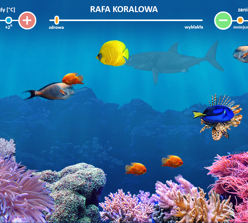 Przeprowadź symulację wpływu temperatury i zanieczyszczenia wody na blaknięcie raf koralowych. Następnie spróbuj wykonać polecenia.